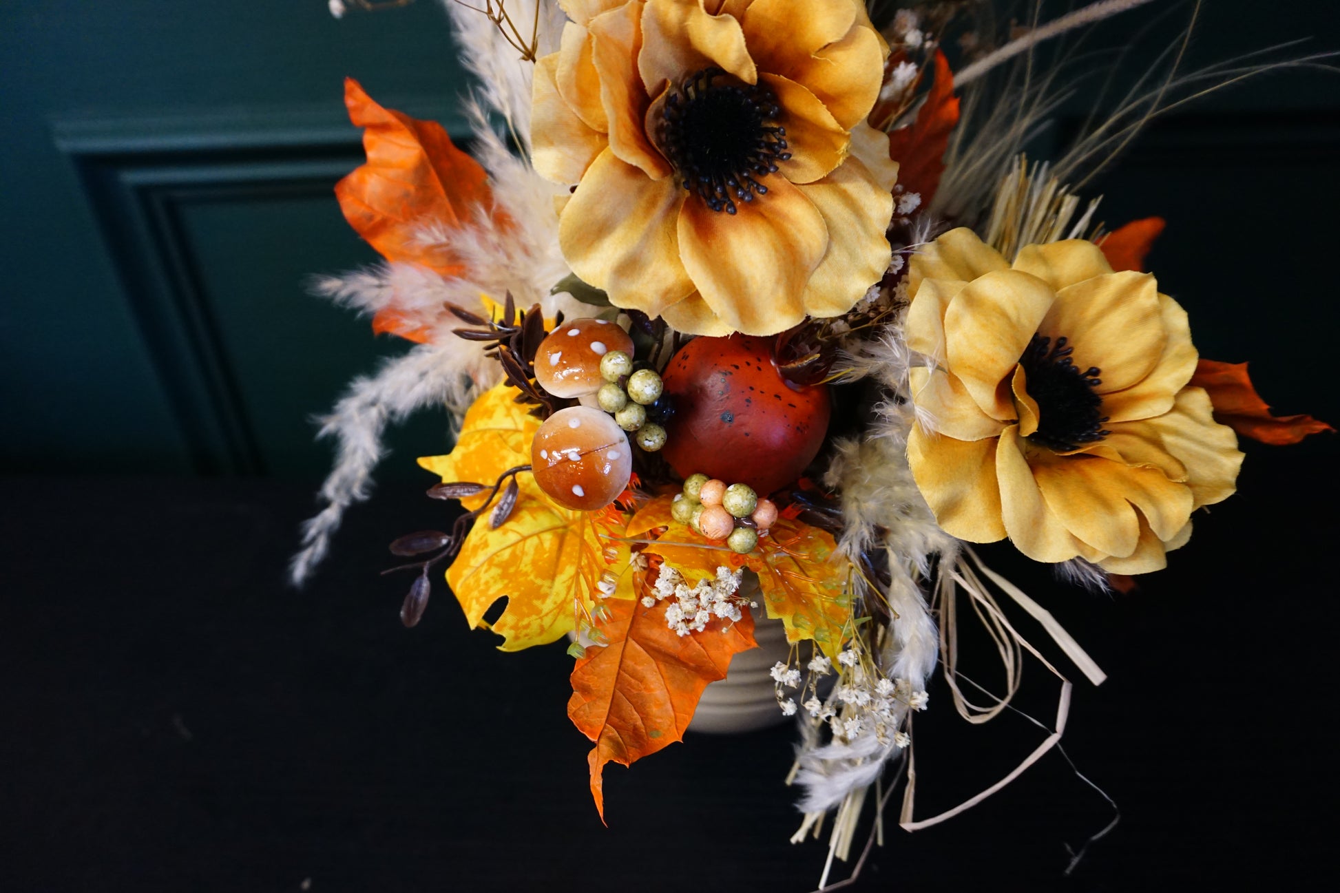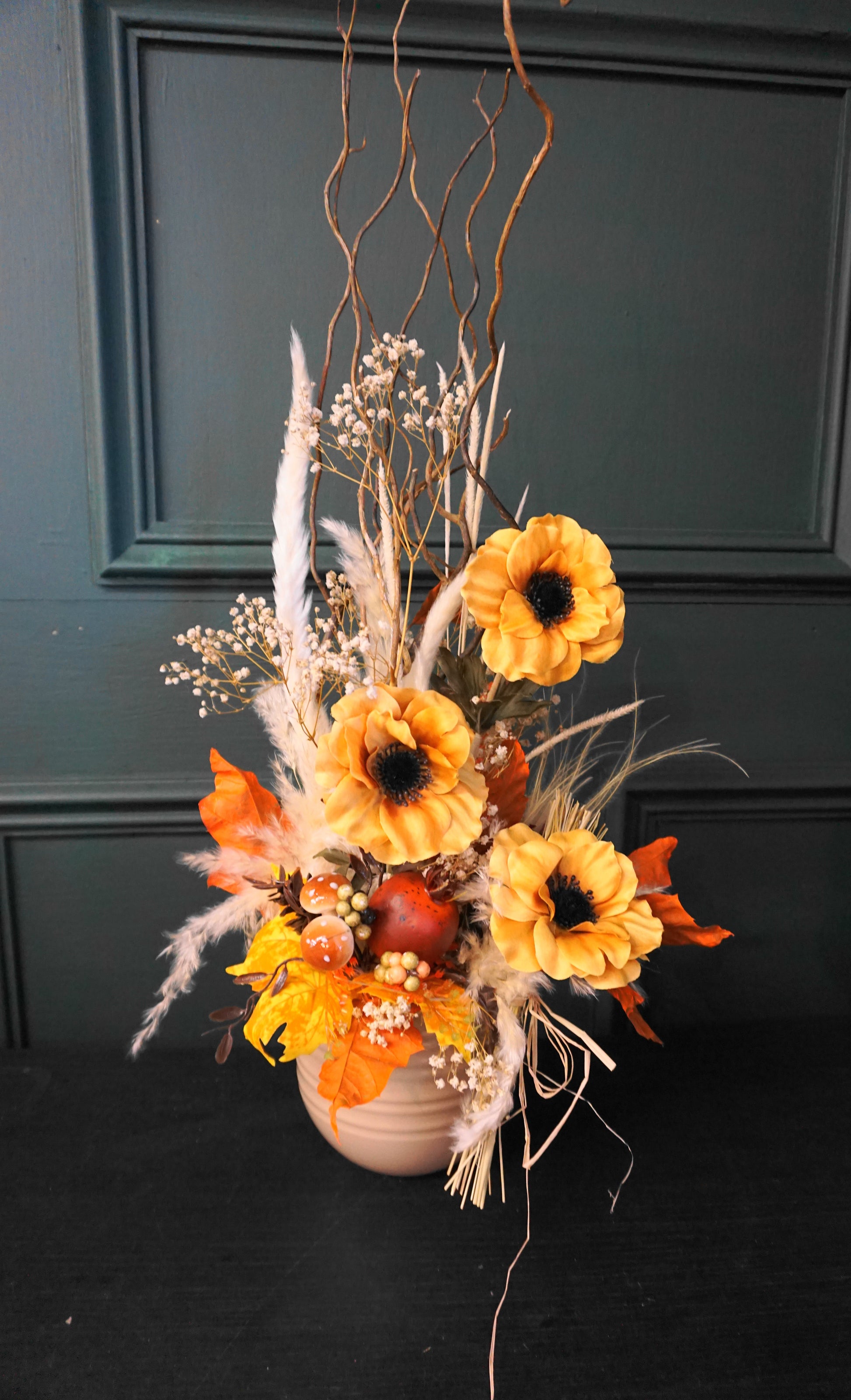 Autumnal silk & dried floral arrangement. Including dried baby's breath, pampas grass & dyed oak leaf. The epitome of Autumn.